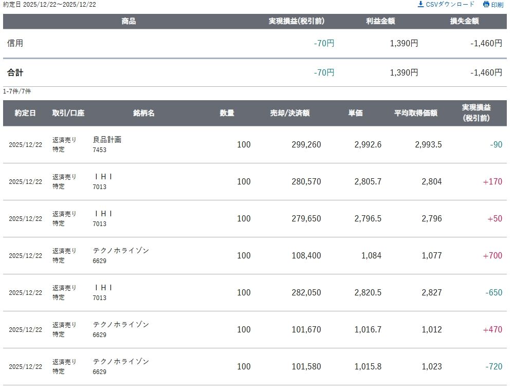 2025/12/22 デイトレード結果