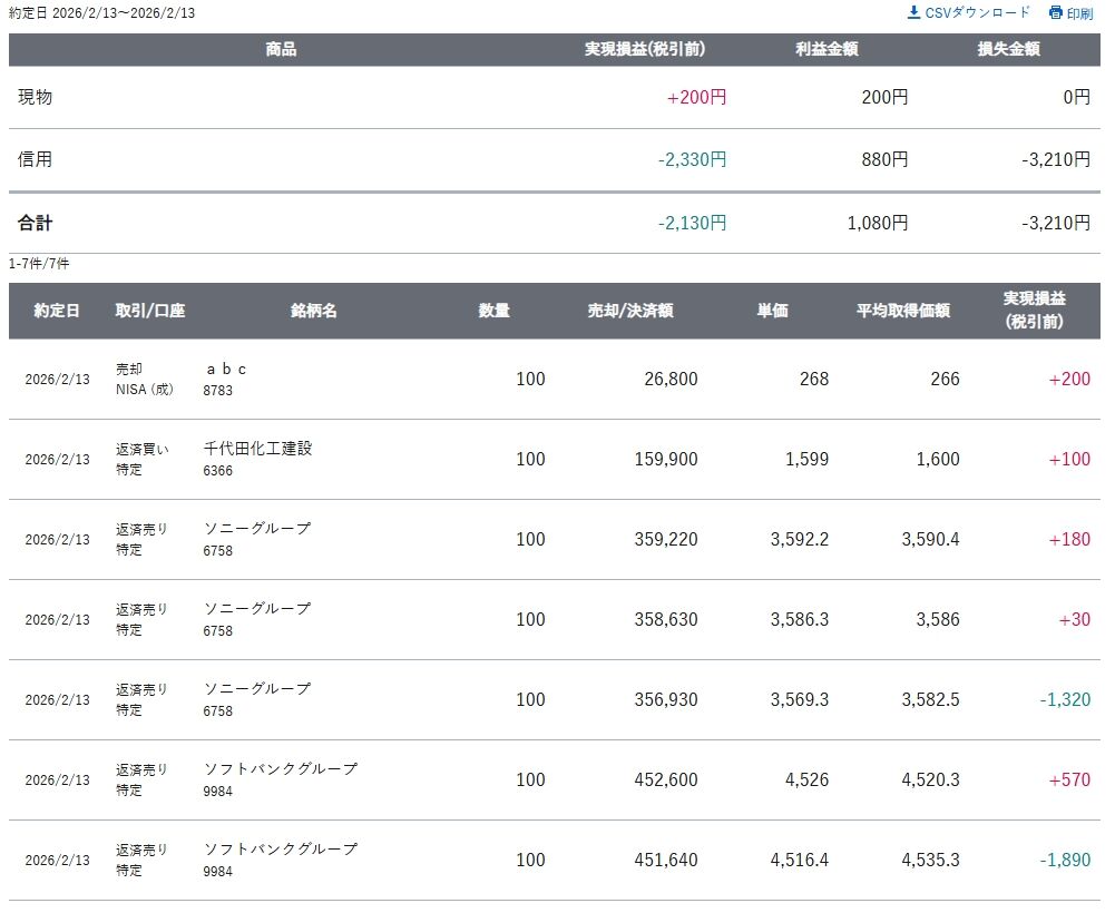 2026/2/13 デイトレード結果